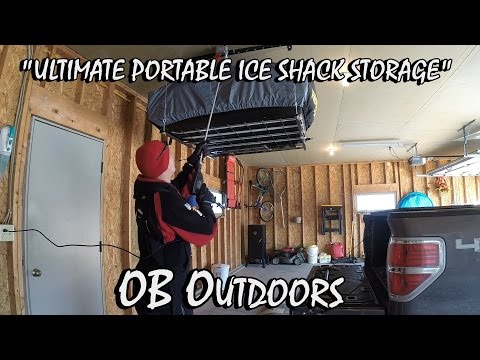Ultimate Portable Ice Shanty Storage - OB Outdoors - Fish House Storage - The Racor Ceiling Storage Lift (PHL-1R) is my favorite way to easily load, unload, and store a portable ice shanty. Its so easy to use and it definitely frees up ...