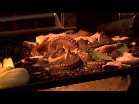 Grillezett polip recept - Calamari Magyarul - Kádár Németh Matild és Frank Sándor mesterszakácsok polipot sütnek vaslapon a Fehértói Halázscsárda díszkútjánál. http://www.fehertoihalaszcsarda.hu/